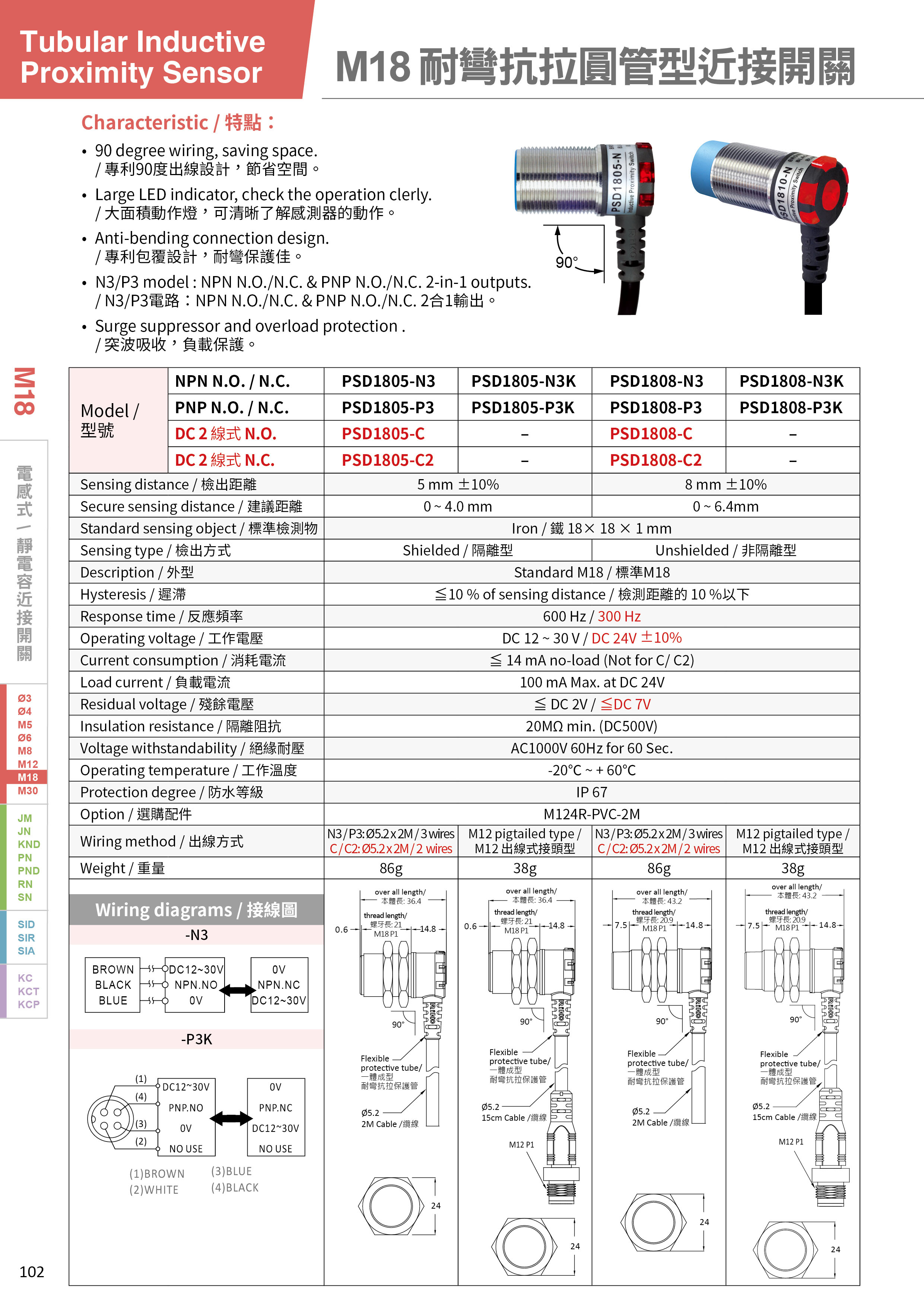 ? 專利90度出線設(shè)計(jì),節(jié)省空間。 ? 大面積動(dòng)作燈,可清晰了解感測(cè)器的動(dòng)作。 ? 專利的包覆設(shè)計(jì),耐彎保護(hù)佳。 ? 突波吸收,負(fù)載保護(hù)。